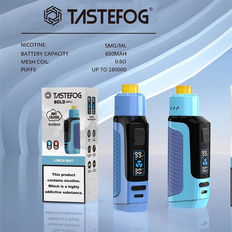 TASTEFOG BOLD is a disposable vape with DTL vaping. it is a classical box mod shape with good grip and a beautiful leather covered. it comes with a screen shows the battery power and E-liquid levels. the power button makes the direct vaping activing and change the vaping mode. it has 2 modes. Smart and Boost mode. people can change the mode according to their own demands. The product uses handmade cotton flocchy technology. It is equipped with a 0.6 ohm low-resistance mesh coil and has a strong explosive power.