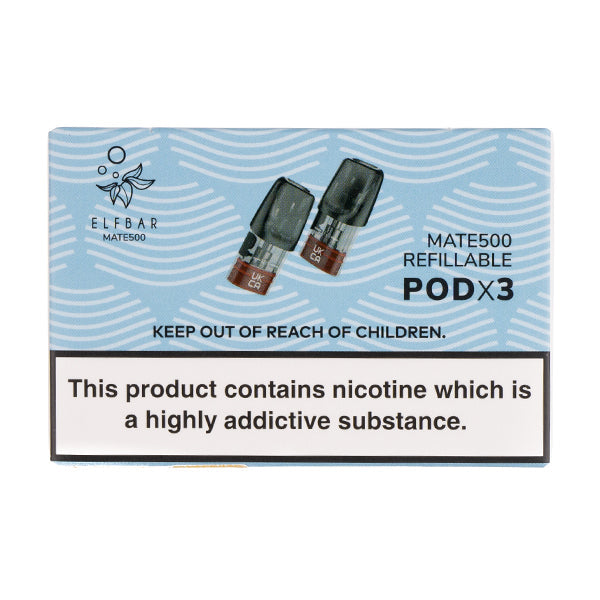 A pack of 3 replacement Mate 500 refillable pods for the . Each refillable pod has a 2ml pod capacity and is compatible with high PG e-liquids. The ELF Bar Mate 500 is suitable for mouth to lung vapers who prefer modest amounts vapour over a cloudy exhale.Â