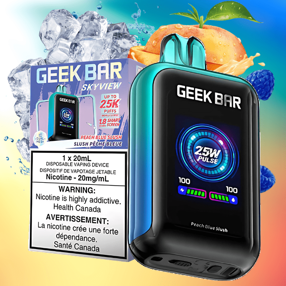 Geek Bar Skyview 25K Disposable vape includes 20ml of e-liquid, allowing for approximately 25,000 puffs. The Skyview Peach Blue Raspberry Slush flavor combines juicy peaches with tangy blue raspberry slushy. Moreover, this refreshing blend offers a delicious beverage flavor, making it perfect for all-day enjoyment. Additionally, Geek Bar excels as a leading disposable brand, known for its portability and ease of use.